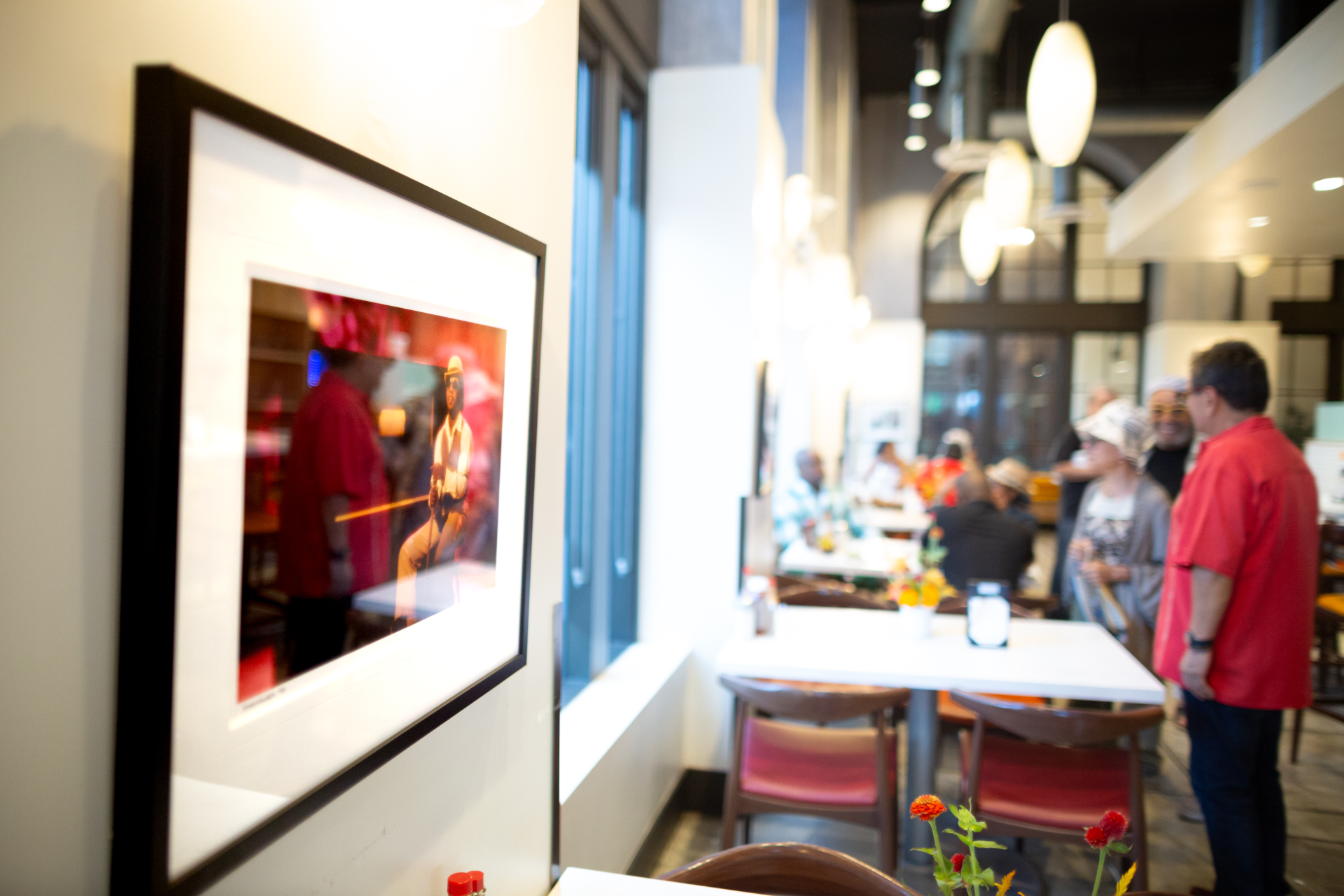 The inaugural exhibition featured the photography of Jimmy Velarde — a Twelve-Time Emmy Award winner and Grammy recipient whose 35mm and digital work spans music, street life, and cinematic storytelling. His images are grainy, emotive, and alive. They do not ask for your attention so much as quietly demand it. Larger works anchor the main walls. Smaller editions near the bar invite the kind of close, unhurried looking that most galleries rarely encourage.