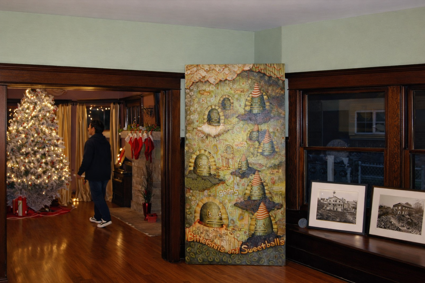 In partnership with La Mancha Gallery, Miracle on 35th Street presented an exclusive exhibition featuring eleven artists whose work collectively reflects the rich, layered visual language of Los Angeles. Paintings, prints, photographs, and graffiti art were installed throughout the evolving spaces of the Big House — a setting that felt entirely right for art made by people who have always built something beautiful from whatever was available.